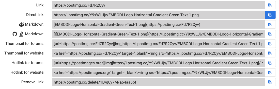 Either drag and drop the image or click “Choose images” to select the image you want to add to the email. You will then see a page like this with the option to copy the “Direct link” (which will end with something like png, jpg, or gif).