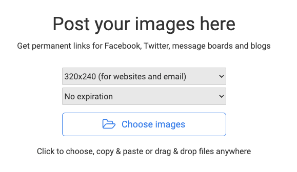 Visit https://postimages.org/ and you should see this interface. In most cases, you will want to resize your image to either